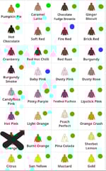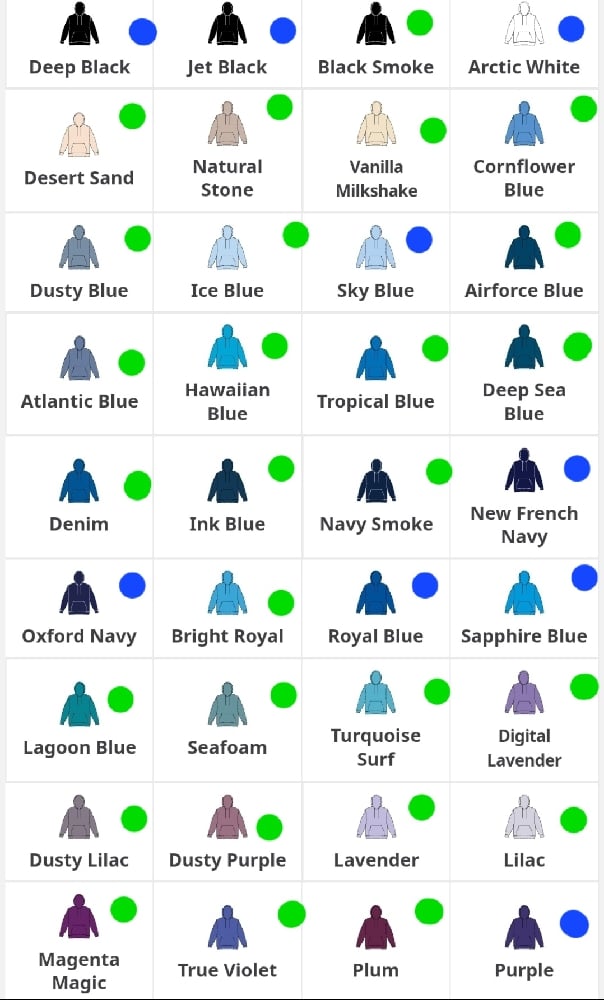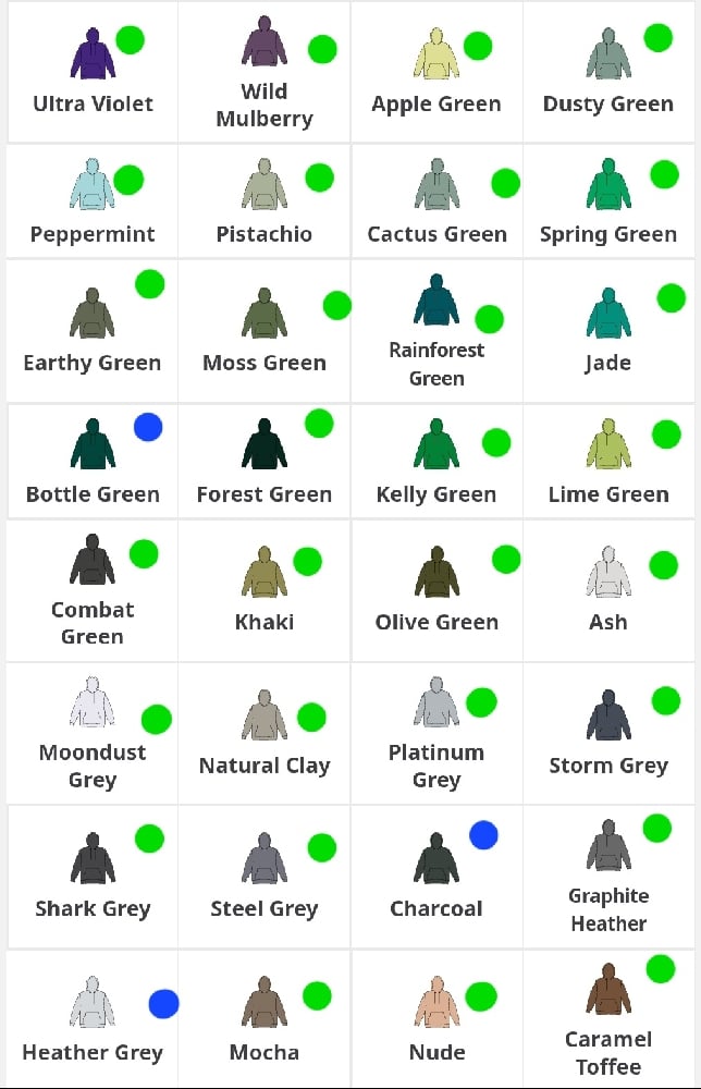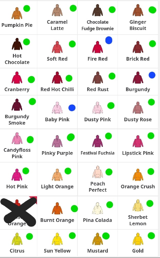 Coloured dots show which size the hoody goes up to.
